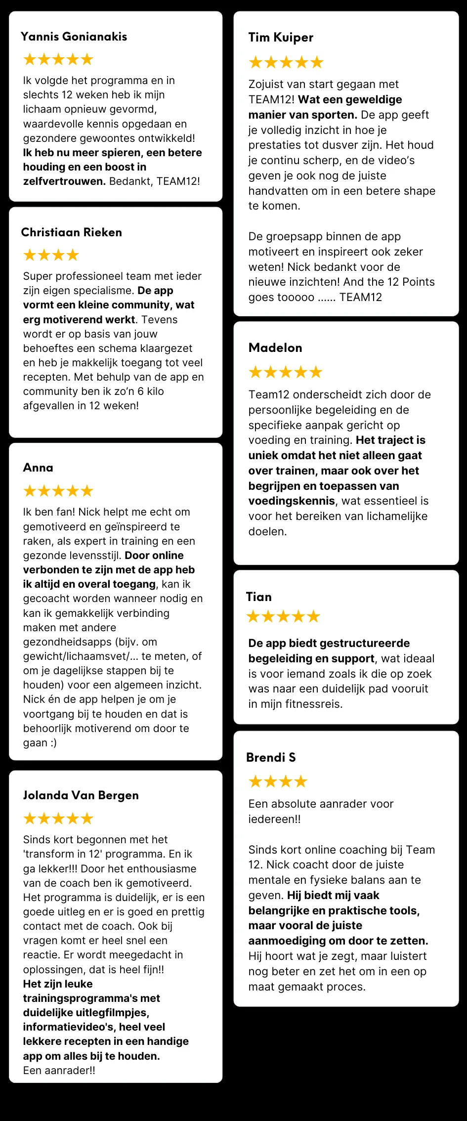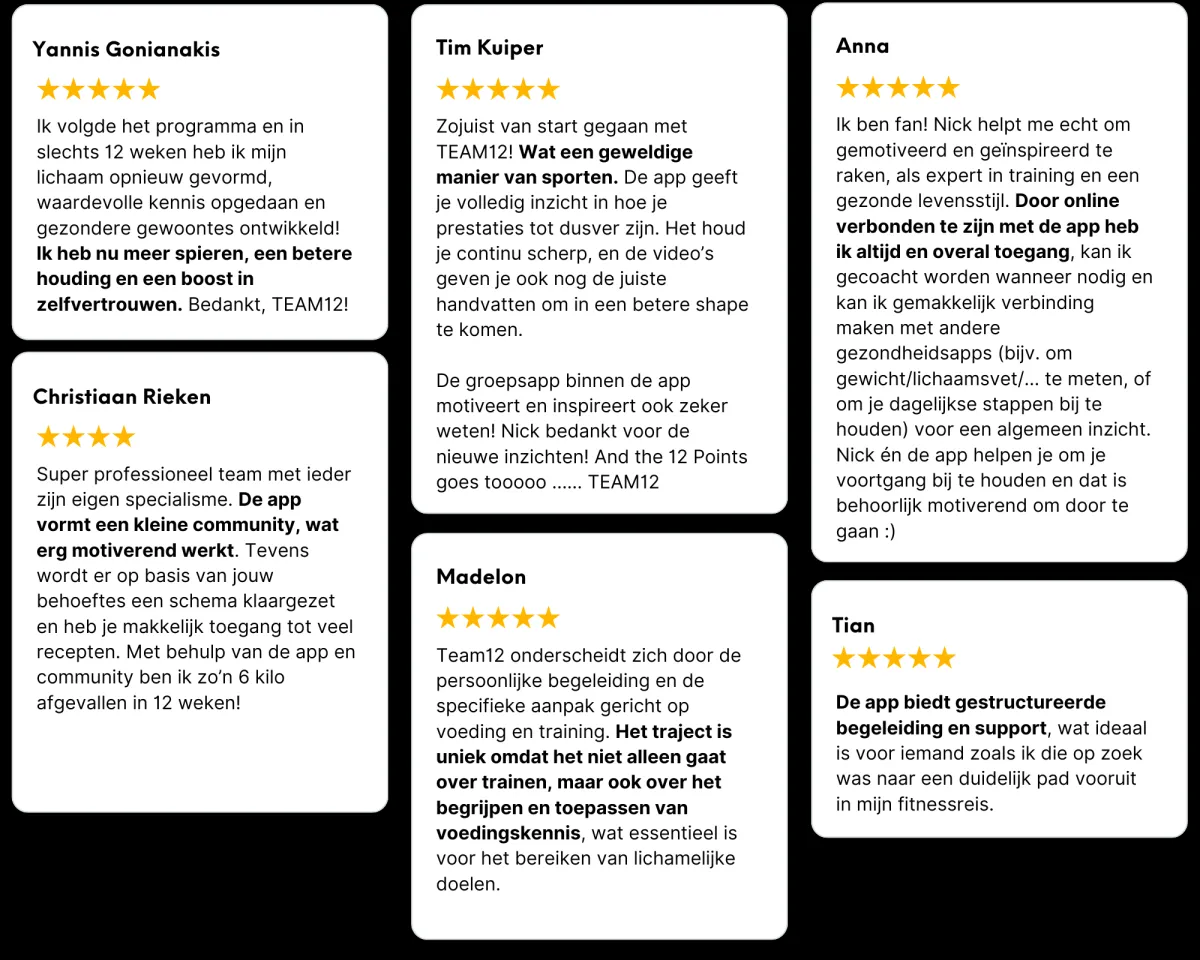 Na de 12 weken heb je niet alleen je fysieke doelen bereikt, maar ook de mentale kracht en gewoontes ontwikkeld om deze resultaten vast te houden. En als je wilt, kun je blijven trainen met de TEAM12 app voor verdere begeleiding tegen een maandelijkse betaling. Onze community blijft een veilige plek waar je altijd steun en inspiratie vindt, zodat je nooit alleen bent in jouw reis naar een gezonder leven.